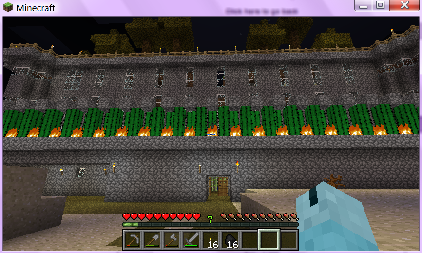 This is the view from the village road that leads into the main gates. As you can see, the secondary outer wall isn't done yet, but the cactus and fire ring surrounds the castle completely, to keep out spiders. I *really* don't like spiders (and my castle has an open-air roof). To either side, you can see the guard towers...
