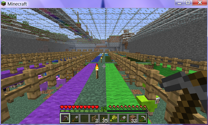 This is the large "intake pen", or white sheep pen. These sheep actually regrow their wool faster than I can sheer it. The chests hold leftovers from digging out the underground pens and glass ceilings. Those byproducts will be used to build the Rainbow Road, among other things.