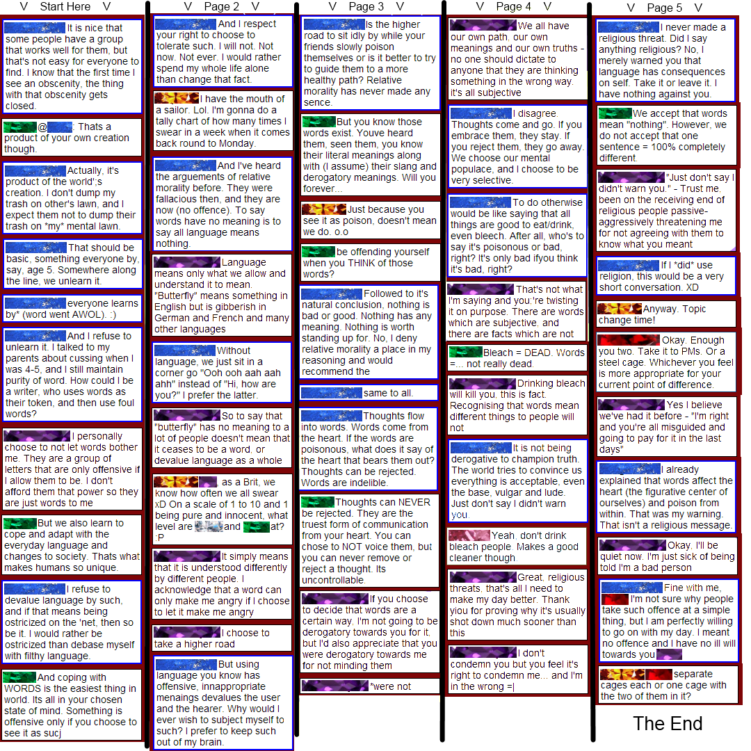 (October 11th, 2012) I was on one of my favorite sites this morning, chatting about a recent site event. The topic of working on teams came up, and I pointed out that it's hard for me to find a team with members who don't use obscenities. A discussion ensued with some very interesting points. To protect the identities of the participants, names have been replaced with gemstone images and background colors (for Mods/Admins) have been filtered out. My posts are the Lapis ones (the blue gemstone). The other participants shall be referred to as Amethyst (purple), Emerald (green), Citrine (gold), Topaz (pink), Ruby (red), and Diamond (white). As this conversation took place in a chatbox, it is read starting in the upper left and going down each column.